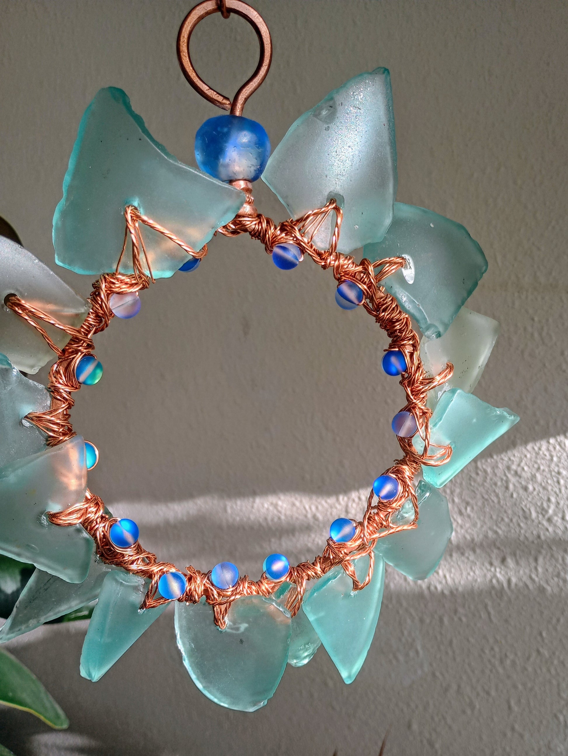 This piece features 31 tumbled pieces of beautiful old light blue glass artfully arranged into a sun shape on hand shaped copper.