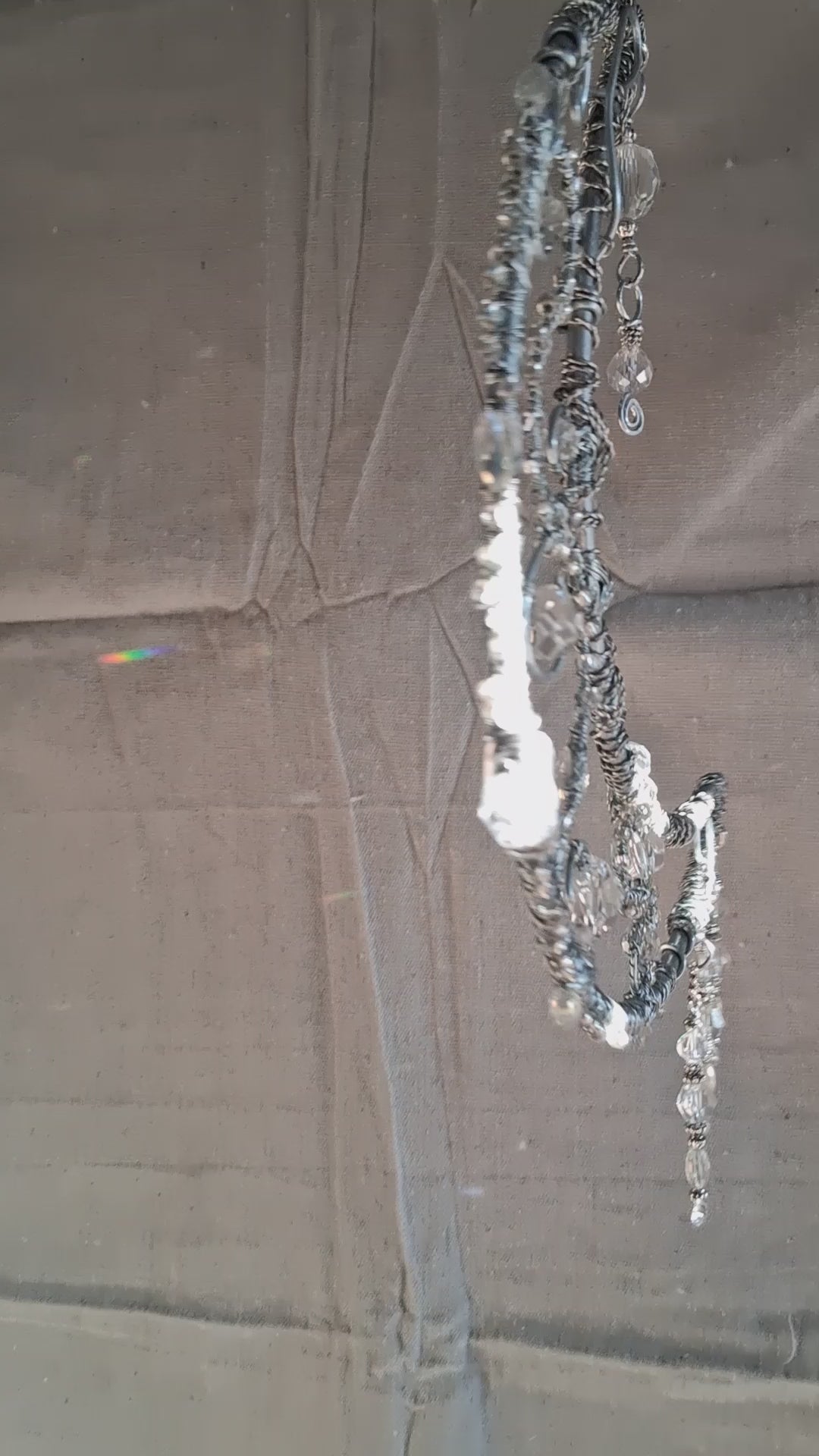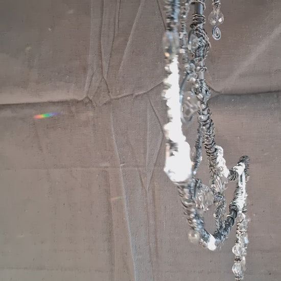 Handcrafted in polished silver-tone metal, this crescent moon suncatcher is thoughtfully embellished with faceted crystals chosen for their clarity and light-catching brilliance. Designed as a sculptural window accent rather than a decorative novelty, it transforms natural sunlight into a subtle, luminous display. Each swirl and drop is individually made, reflecting a commitment to craftsmanship, balance, and the enduring elegance of celestial form.