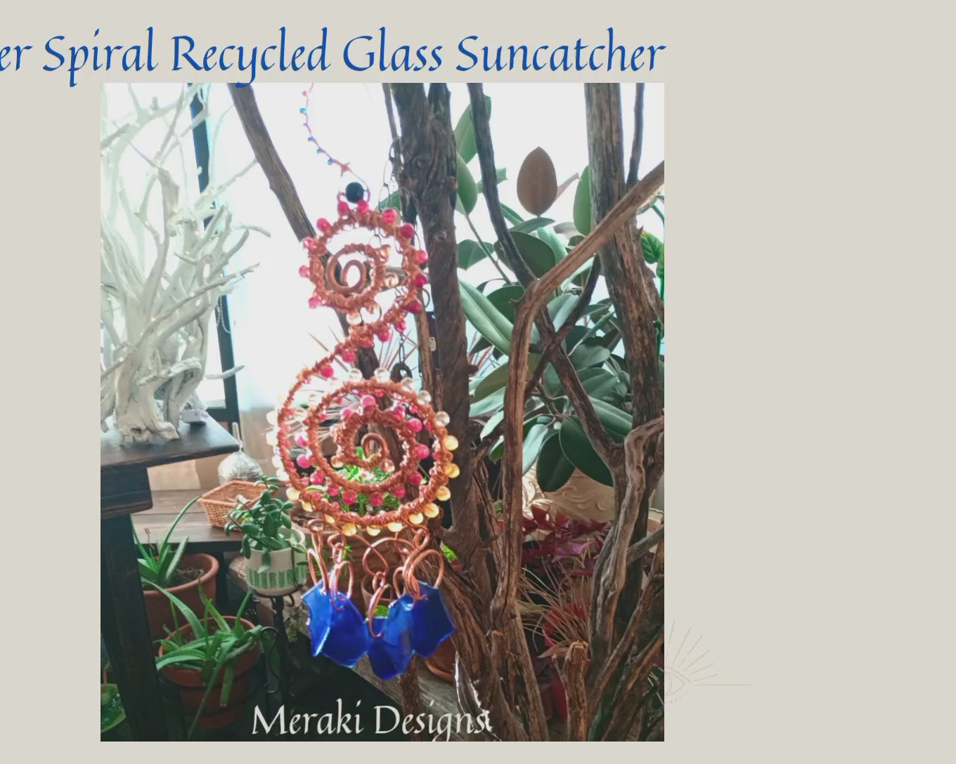 Bold and elegant, our copper spiral and recycled blue Glass suncatcher will add a touch of eclectic charm to any room. Tumbled shards of recycled blue glass merge into a subtle cascade of shape and color. This bold and elegant piece, made with recycled blue glass and copper, features red and yellow iridescent glass beads in a unique spiral design. Its presence is truly captivating.