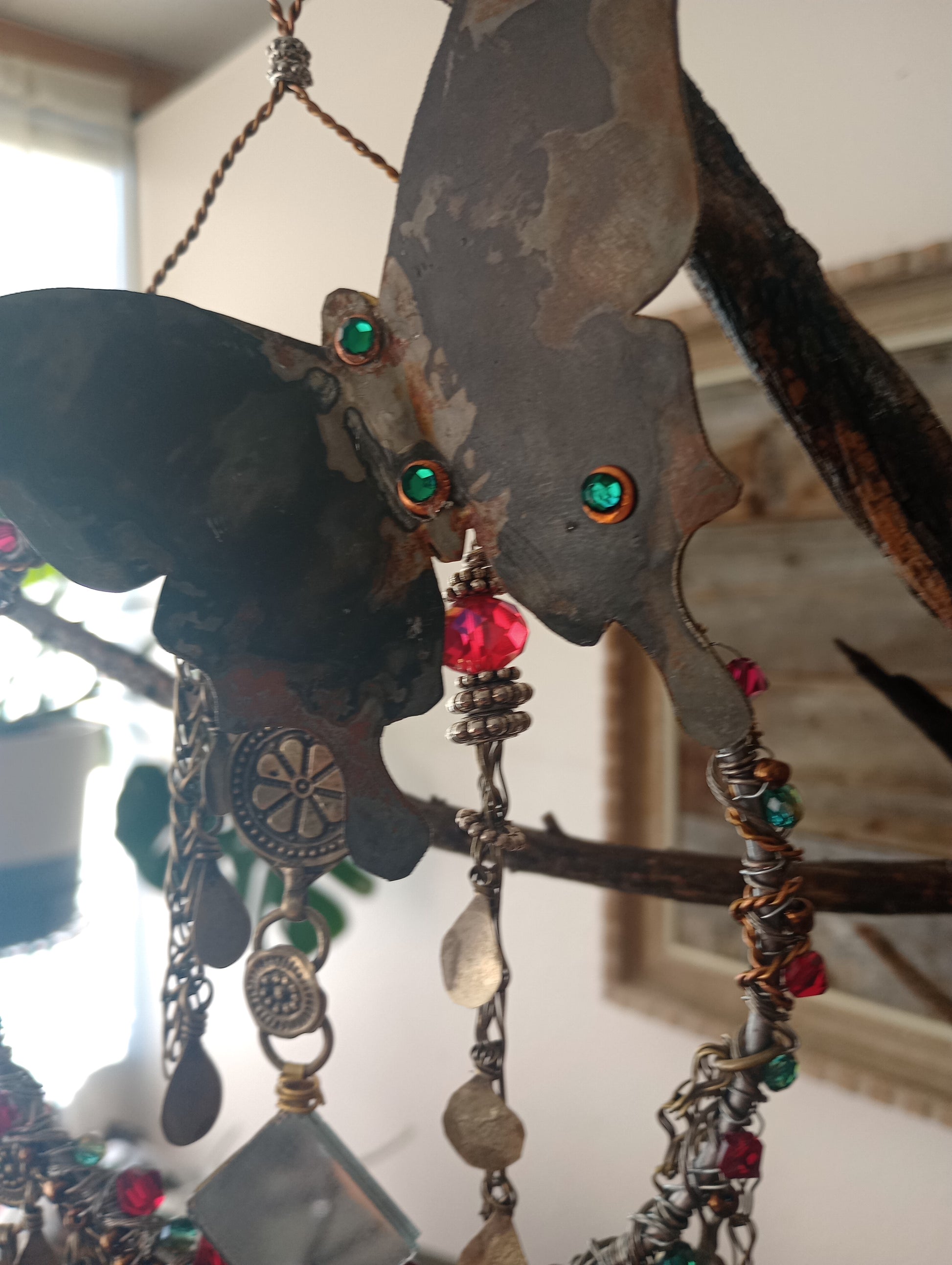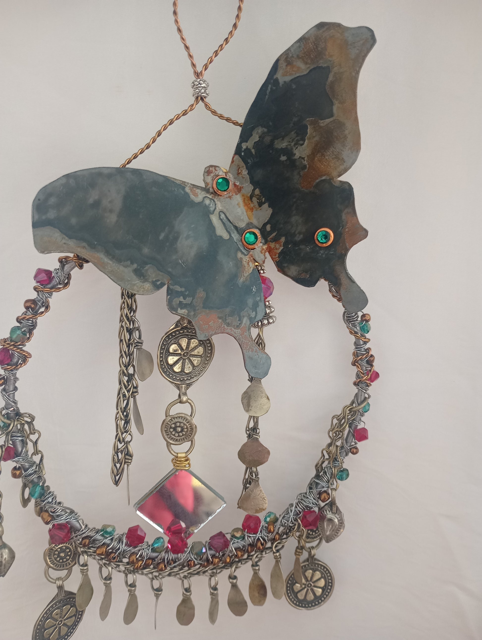 An eclectic fusion of vintage, modern, and ethnic embellishments lend to the unique spirit of this artisan crafted butterfly suncatcher.
