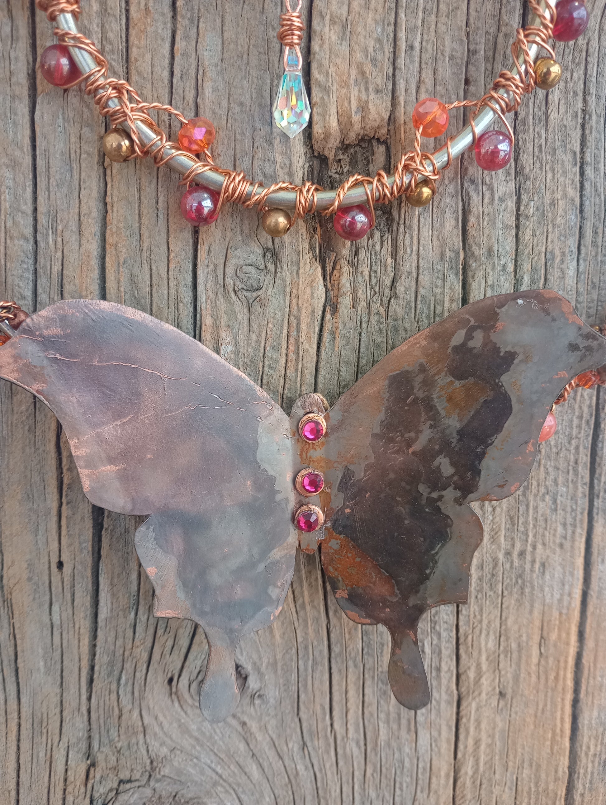 Graceful and majestic, this enchanting butterfly is hand cut from 24- gauge mild steel with a flame finish and rusted patina, accented with green Swarovski crystals.