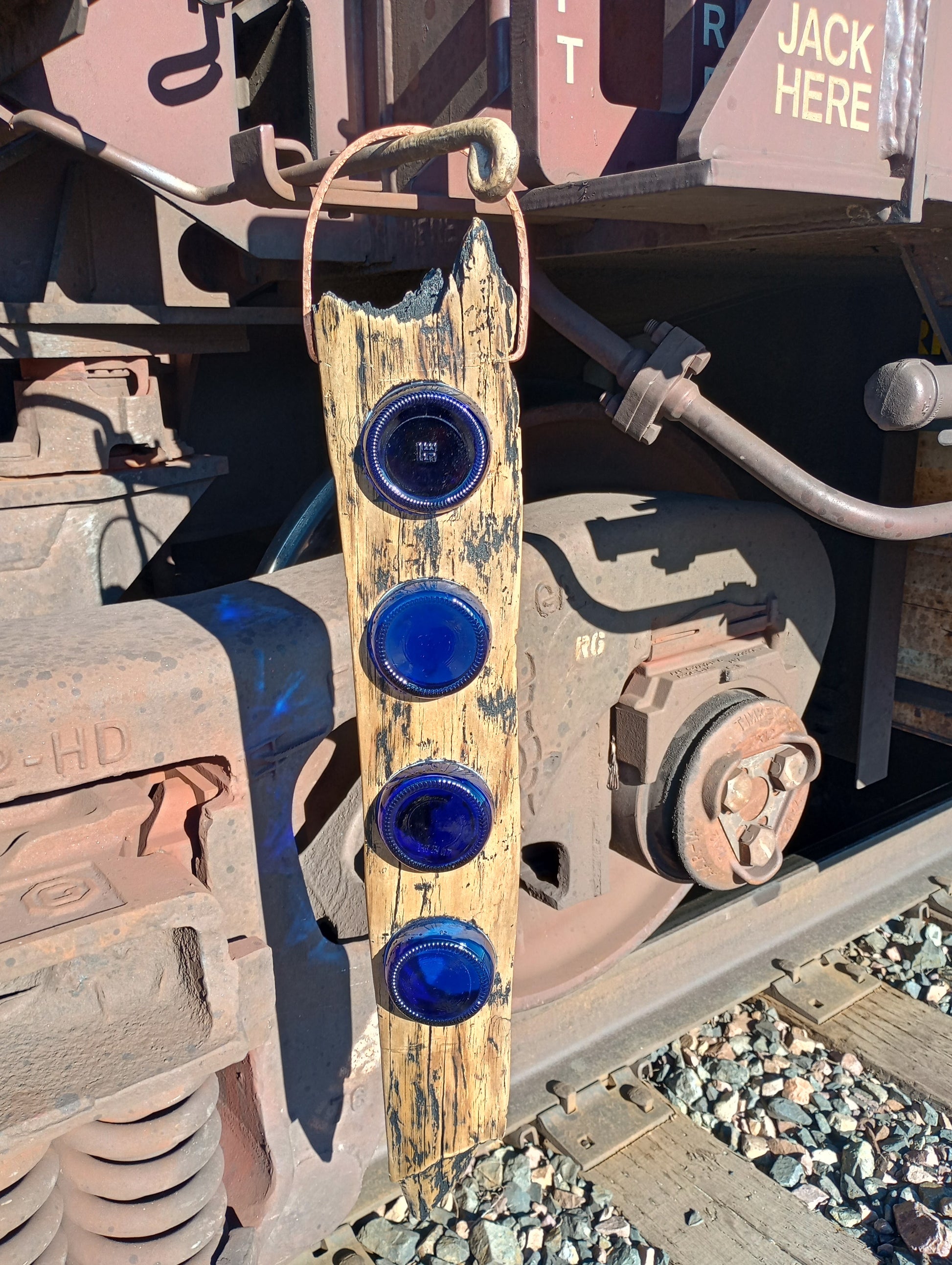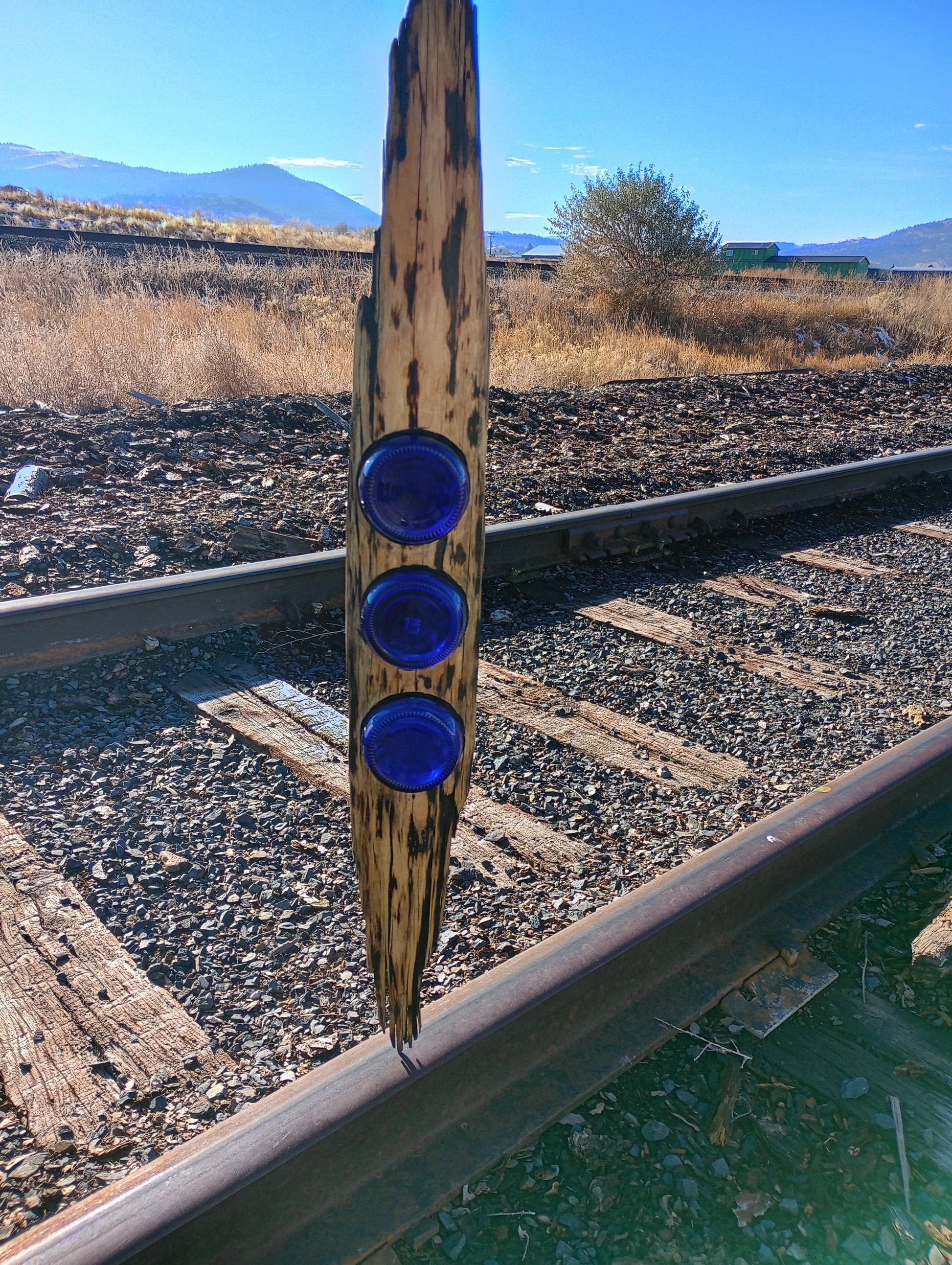 Recycled blue glass glows beautifully from splintered log wood collected on Montana railway.