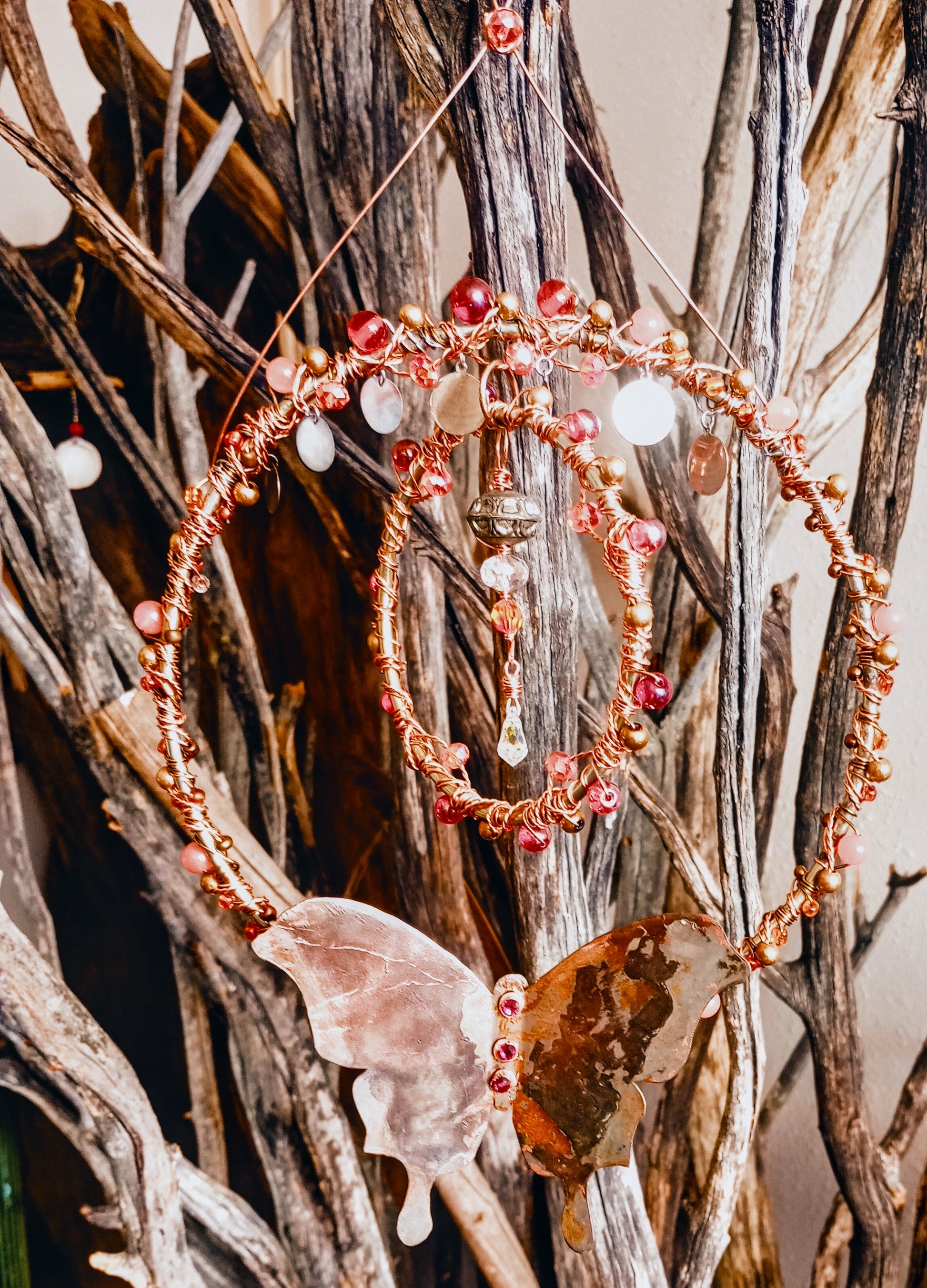 Swarovski crystals and luminescent semi-precious stone beads are weaved with braided copper and bronze wire around two metal rings.