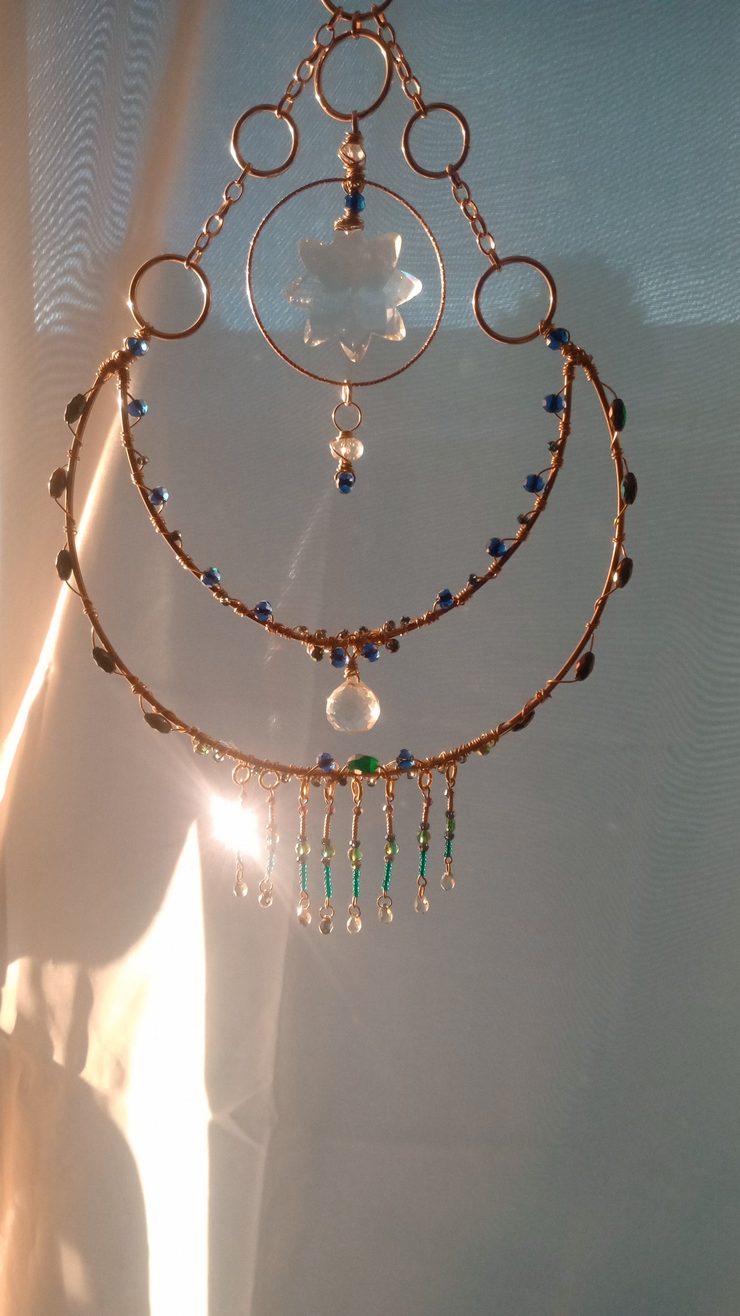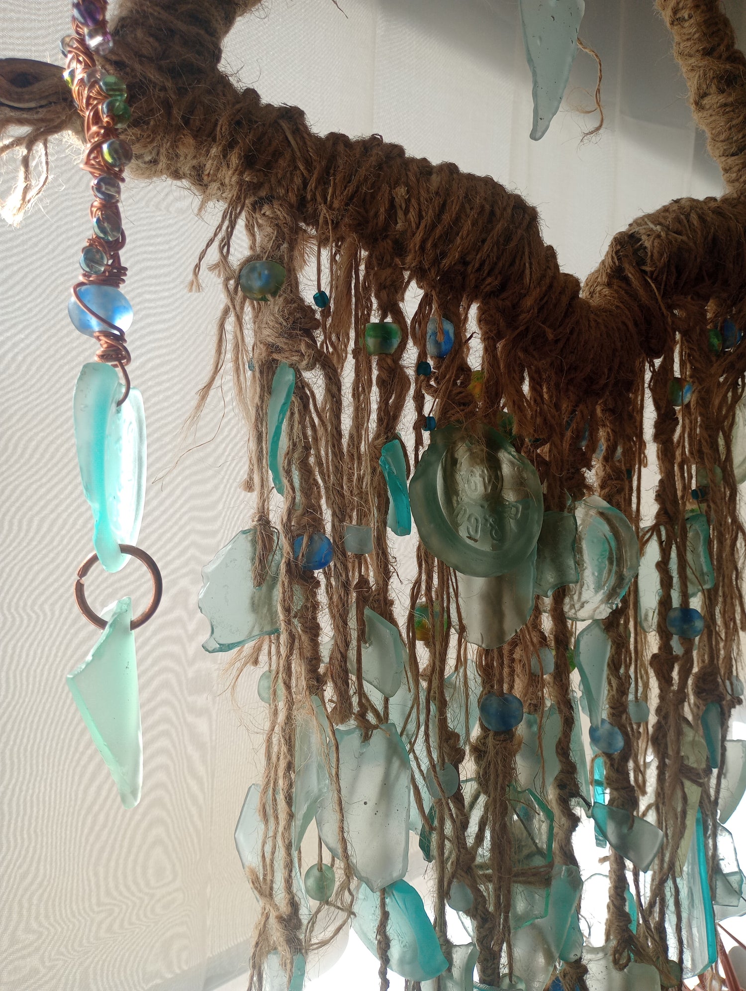 Beautifully crafted with reclaimed wood from train tracks and recycled glass. Hand collected materials.